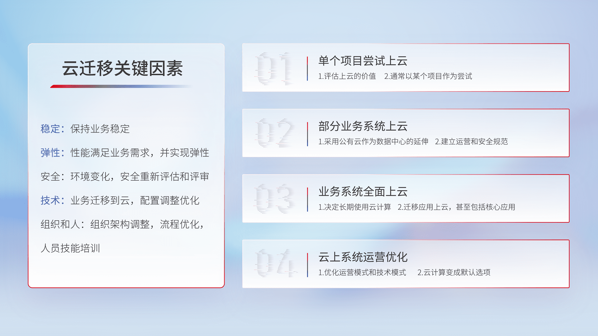 结合实际业务,,,从规划设计、、云平台选型、、、、云原生改造、、数据迁移、、集成交付,,迁移全过程为客户识别最佳上云路径,,,做好风险识别管理,,,设计网络架构、、身份权限、、、、安全审计合规、、操作审计、、日志审计、、、监控告警策略、、多站点容灾设计等,,,对云上基础设施进行整体规划,,,,提升IT治理水平,,,,以满足弹性、、高可用、、、、高性能的需求。。