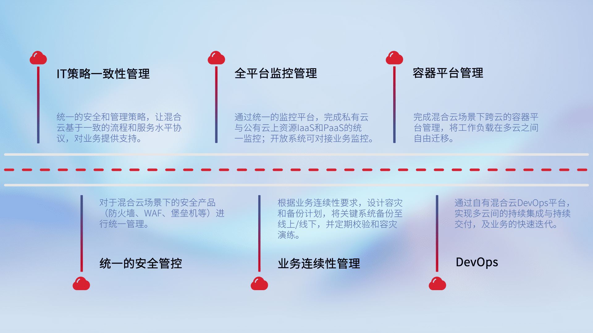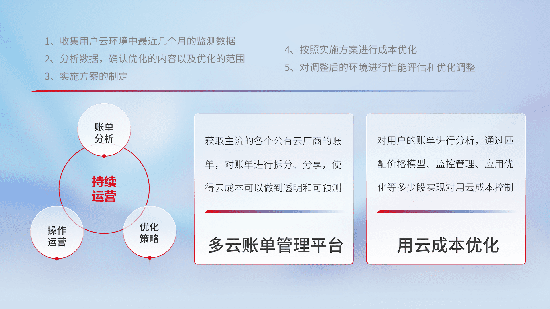 通过多云纳管,,以统一的资源数据模型把客户的云资源进行抽象和封装,,,进而实现对多云资源的统一操作,,保障云资源管理的可靠性、、、、稳定性与可用性。。。。量身定制化运维内容,,配置、、、、开发运维、、、补丁管理、、、备份、、监控、、、、认证和访问管理、、、、审计和日常巡检等,,,保障在用云过程中的可靠度,,,稳定度以及高可用率。。。。