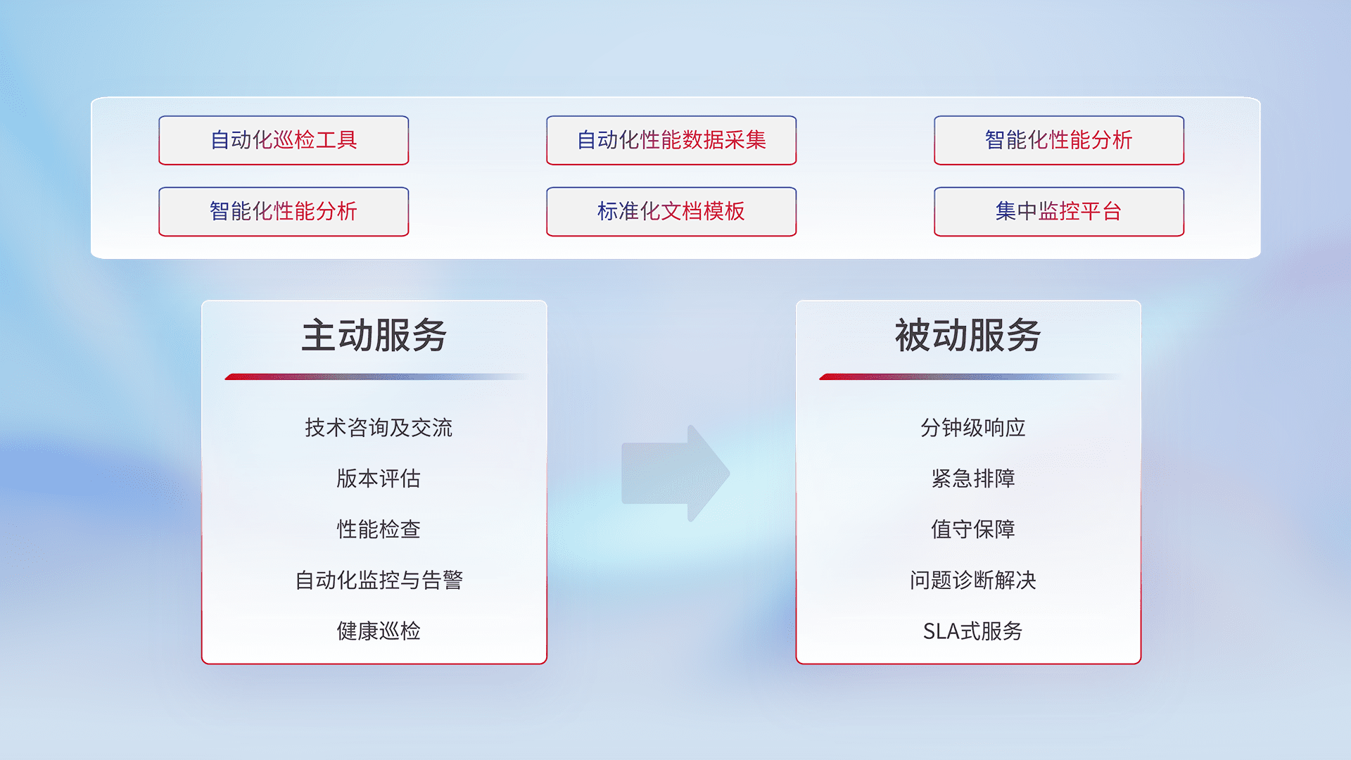 智能化工具和标准化文档,,,,保障服务质量,,,,提供主动服务(包含技术咨询、、版本评估、、、性能检查、、、、自动化监控与告警、、、、健康巡检)和被动服务包含(分钟级响应、、、紧急排障、、、、值守保障、、问题诊断解决、、SLA服务)。。。。